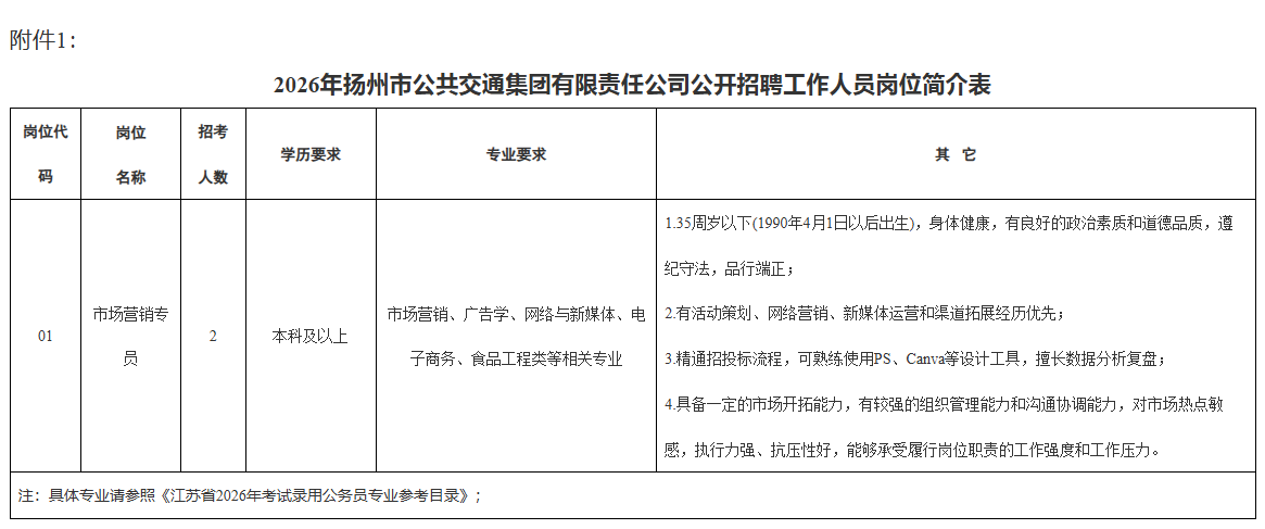 5.符合《2026年扬州市公共交通集团有限责任公司公开招聘工作人员岗位表》(以下简称《岗位简介表》,附后)中各岗位所规定的学历、专业及其他相关要求。其中国(境)外留学人员需取得教育部留学服务中心出具的学历学位认证书;