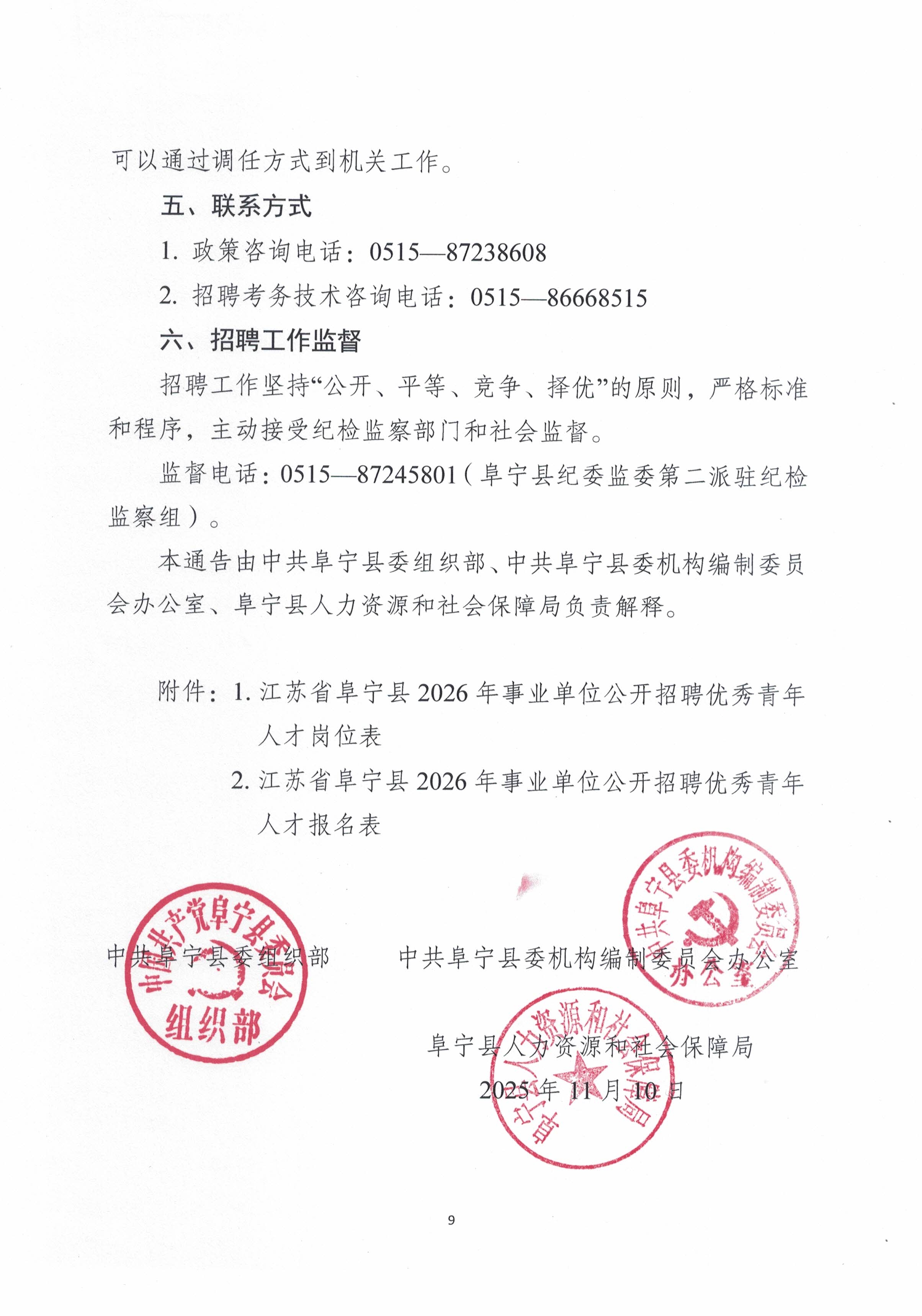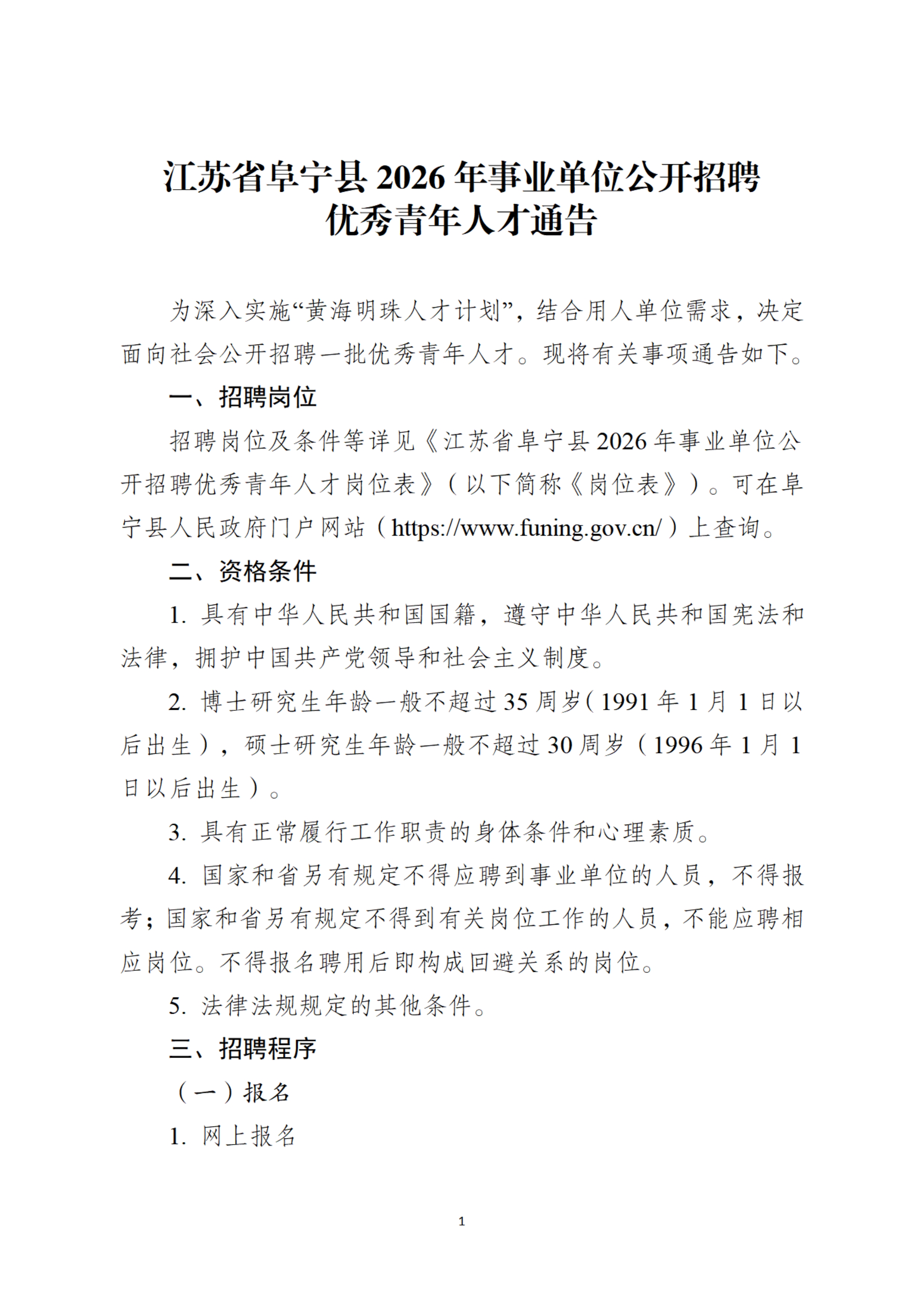江苏省阜宁县2026年事业单位公开招聘优秀青年人才通告