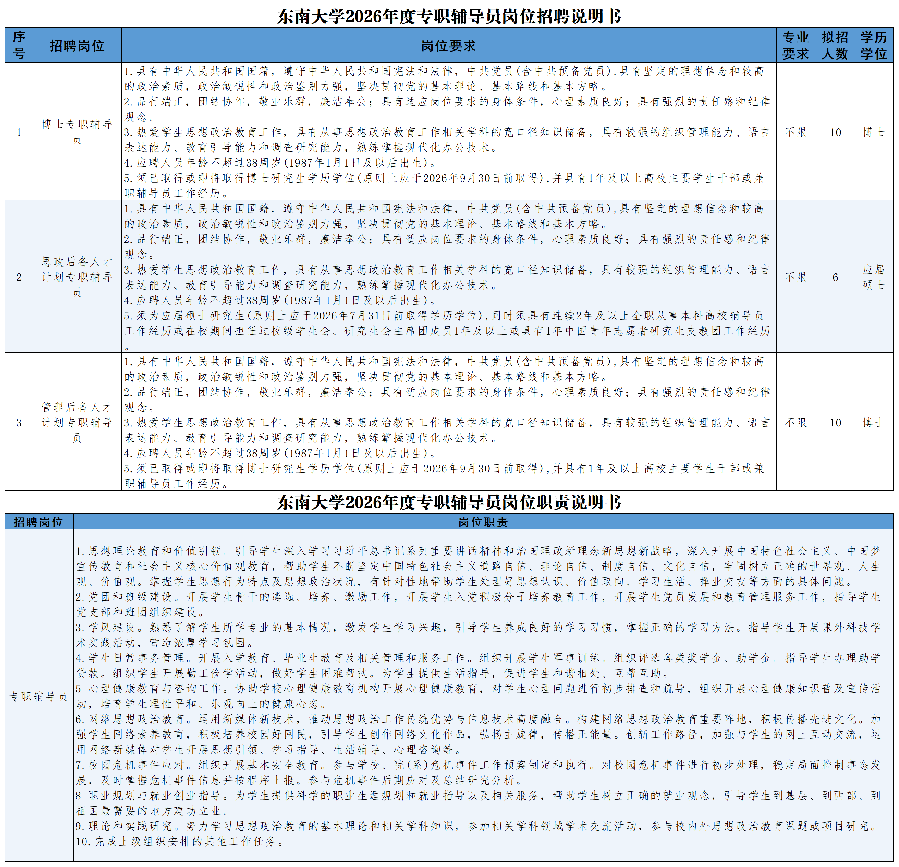 具体岗位职责及要求详见《东南大学2026年度专职辅导员岗位招聘说明书》,见附件。