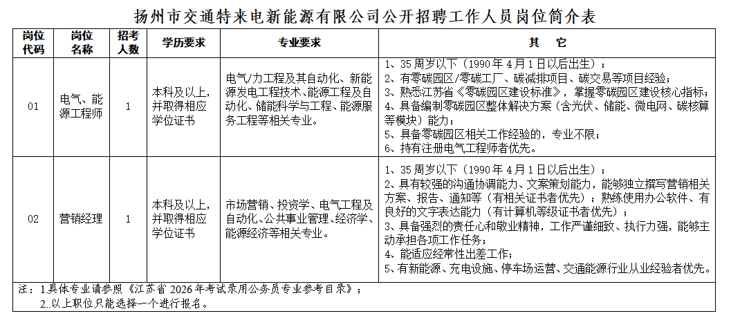附件:1、《扬州市交通特来电新能源有限公司公开招聘人员岗位表》;2、报名材料清单;3、《江苏省2026年度考试录用公务员专业参考目录》。